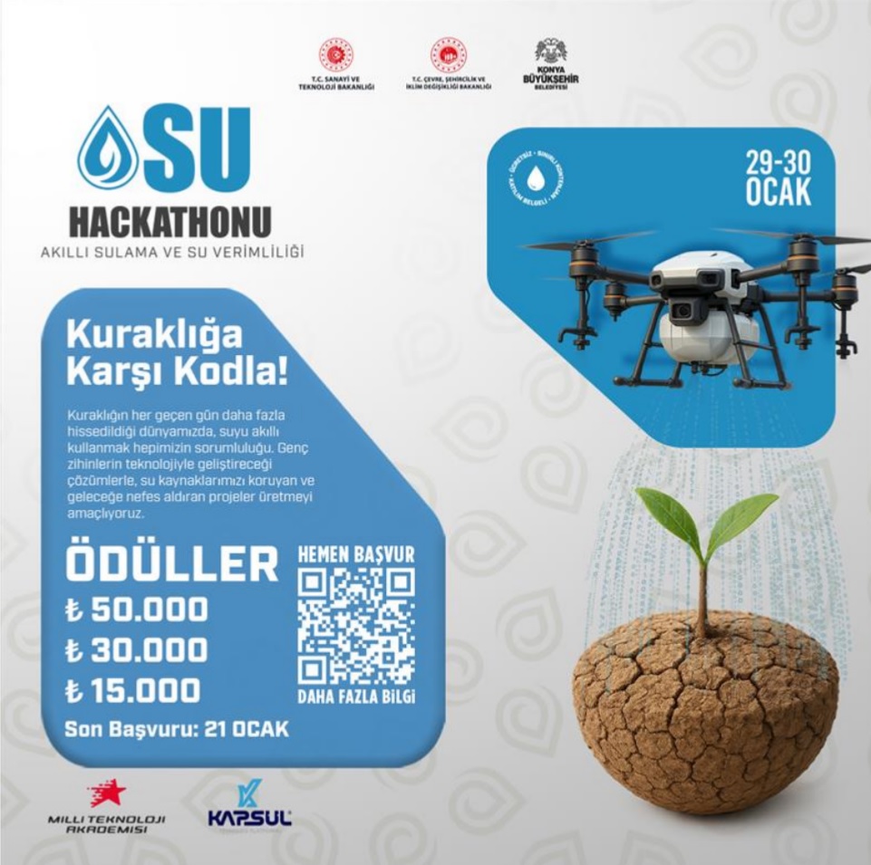 birliğiyle 29–30 Ocak 2026 tarihlerinde Konya'da Su Hackathonu düzenleneceği ve suyun geleceğini teknolojiyle şekillendirmek isteyen
